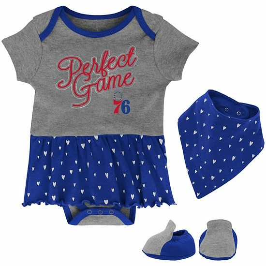 The littlest member of your family will look like the cutest Philadelphia 76ers fan in this Practice Makes Perfect set. The bodysuit features the official Philadelphia 76ers logo and an adorable ruffle skirt with a heart pattern that matches the bib perfectly. Slide on the color-coordinated booties for some added warmth and comfort.