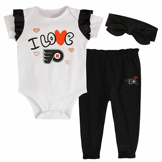 Ensure your little one can fully showcase how excited they are to see the Philadelphia Flyers play with this I Love Hockey bodysuit, pants and headband set. Featuring Philadelphia Flyers graphics on the bodysuit and pants, this adorable set is crafted from soft fabric for match-long comfort. Best of all, the bodysuit’s three-snap bottom and the pants’ elastic waistband provide easy dressing.