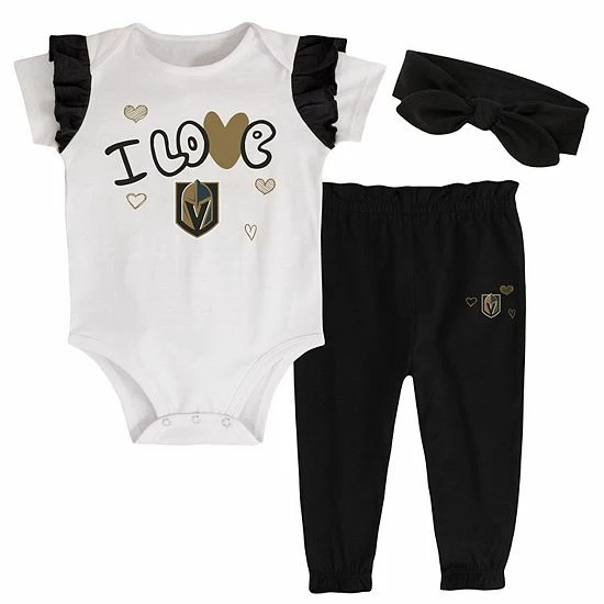 Ensure your little one can fully showcase how excited they are to see the Vegas Golden Knights play with this I Love Hockey bodysuit, pants and headband set. Featuring Vegas Golden Knights graphics on the bodysuit and pants, this adorable set is crafted from soft fabric for match-long comfort. Best of all, the bodysuit’s three-snap bottom and the pants’ elastic waistband provide easy dressing.