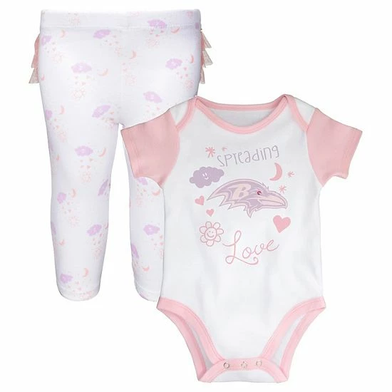 Encourage cheerful Baltimore Ravens spirit with this Spreading Love bodysuit and leggings set. It features the Baltimore Ravens logo printed in colors matching the cute pattern on the front and all over the bottoms. The attached tutu adds a fun finishing touch.
