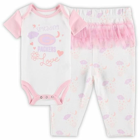 Encourage cheerful Green Bay Packers spirit with this Spreading Love bodysuit and leggings set. It features the Green Bay Packers logo printed in colors matching the cute pattern on the front and all over the bottoms. The attached tutu adds a fun finishing touch.
