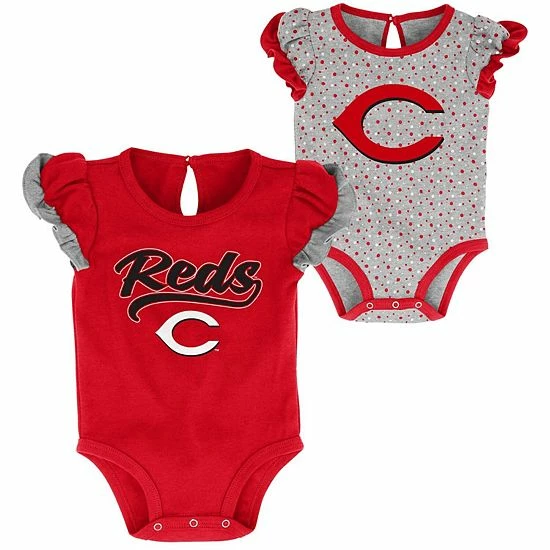 Everyone will Scream and Shout when they see your little one in one of these adorable Cincinnati Reds bodysuits. This two-pack set features charming Cincinnati Reds graphics and cute ruffled sleeves. Plus, bottom snaps allow for quick and easy dressing.