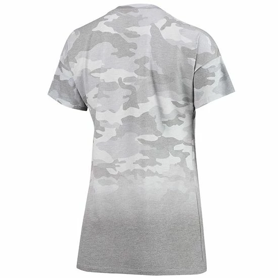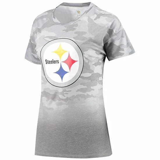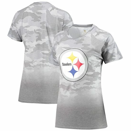 Create a fun, stylish Pittsburgh Steelers outfit with this Beth Dip-Dye T-shirt. It features the Pittsburgh Steelers logo printed across the front and a splash of team color at the bottom. Plus, an allover camo pattern gives this attention-grabbing tee a trendy look.
