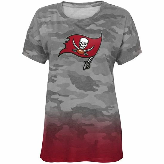 Create a fun, stylish Tampa Bay Buccaneers outfit with this Beth Dip-Dye T-shirt. It features the Tampa Bay Buccaneers logo printed across the front and a splash of team color at the bottom. Plus, an allover camo pattern gives this attention-grabbing tee a trendy look.