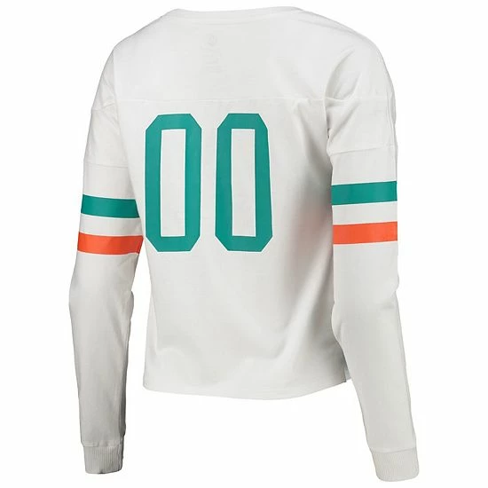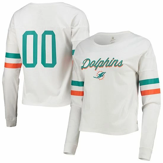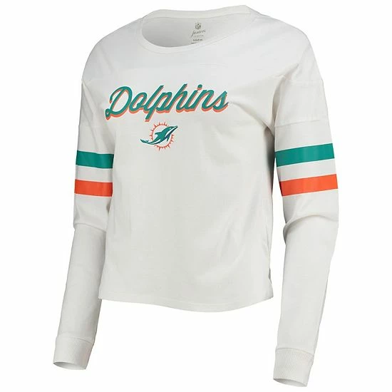 When cooler weather kicks off during the Miami Dolphins season, stay warm in this stylish Carli Crop T-shirt. It features printed Miami Dolphins graphics highlighted by the coordinating sleeve stripes. The numbers on the back also give this crop top a jersey-like touch.