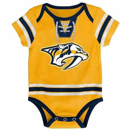 This NHL season, your littlest fan can join the fun with this Nashville Predators Hockey Pro bodysuit. Its jersey-like graphics and official team colors will help them represent your family’s favorite team in the league. This Nashville Predators bodysuit is also designed with a three-snap closure for easy dressing between periods.