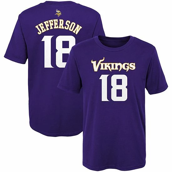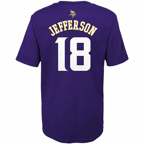 Continue to strengthen growing pride in rooting for the Minnesota Vikings with this Justin Jefferson Mainliner Player Name and Number T-shirt. It features the official team wordmark across the chest and Justin Jefferson graphics on the back. Cotton fabric also makes this Minnesota Vikings tee comfortable to wear all day.