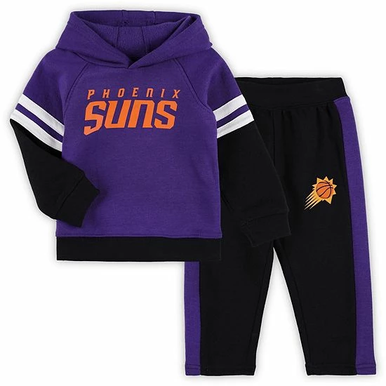 Help your little one get into the Phoenix Suns spirit with this Miracle On Court pullover hoodie and pants set. The top features fleece lining and raglan sleeves, which helps them stay warm and comfortable during every wear. The prominent team graphics displayed on this cozy combo are sure to get your kiddo pumped up for Phoenix Suns game day.