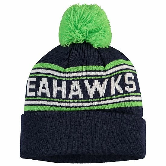 When temperatures begin to drop, keep your youngster toasty and ready to cheer on the Seattle Seahawks in this Jacquard cuffed knit hat. As an already fervent fan, your kiddo will love the Seattle Seahawks graphics on the front cuff and wrapped around the crown. Boasting a pom topper, this cozy knit hat will have them showing their franchise pride no matter the conditions.