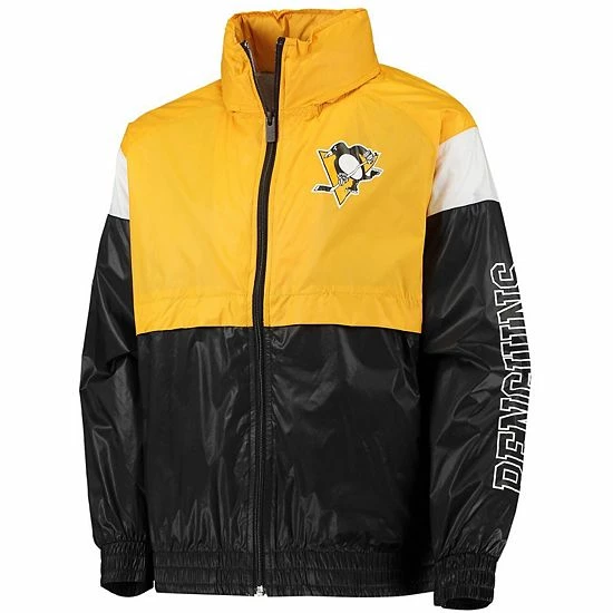 When cold winds threaten to ruin the day, help your young Pittsburgh Penguins fan meet them head on with this Goal Line windbreaker jacket. Its distinctive design features a mock neck collar and hood for extra chill protection. This full-zip jacket is finished with crisp Pittsburgh Penguins graphics and a team colorway, so your youngster can keep warm and rep their favorite team in the league.