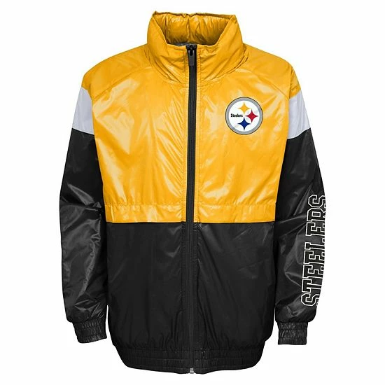Stay covered in Pittsburgh Steelers style on breezy days with this Goal Line Stance hoodie windbreaker. It features bold team graphics and a two-tone design in team colors. Be game day ready no matter the weather by grabbing this Pittsburgh Steelers full-zip jacket.
