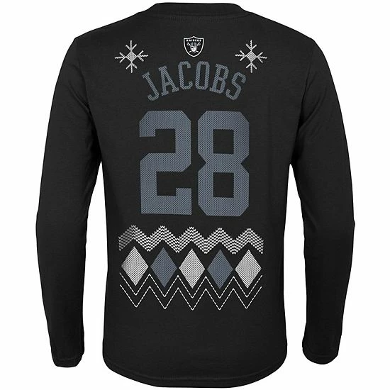 Josh Jacobs is ready to help celebrate the holidays with this Holiday Name and Number long sleeve T-shirt. This festive Las Vegas Raiders tee features your kiddo’s favorite player, along with a holiday-inspired design that includes snowflakes and reindeer! Your young fan will be excited and properly prepared to support their team on game day this season when they have this soft T-shirt.