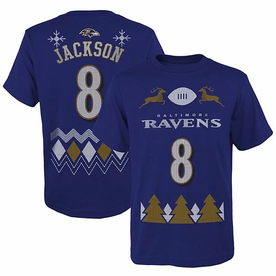 Lamar Jackson is ready to help celebrate the holidays with this Holiday Name and Number T-shirt. This festive Baltimore Ravens tee features your kiddo’s favorite player, along with a holiday-inspired design that includes snowflakes and reindeer! Your young fan will be excited and properly prepared to support their team on game day this season when they have this soft T-shirt.