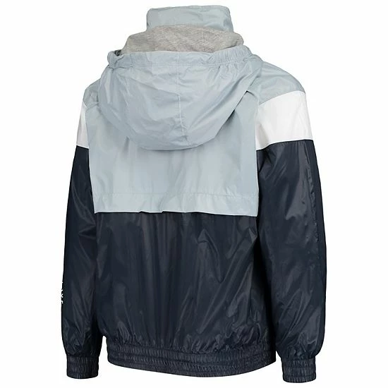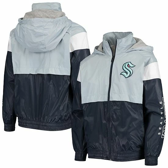When cold winds threaten to ruin the day, help your young Seattle Kraken fan meet them head on with this Goal Line windbreaker jacket. Its distinctive design features a mock neck collar and hood for extra chill protection. This full-zip jacket is finished with crisp Seattle Kraken graphics and a team colorway, so your youngster can keep warm and rep their favorite team in the league.