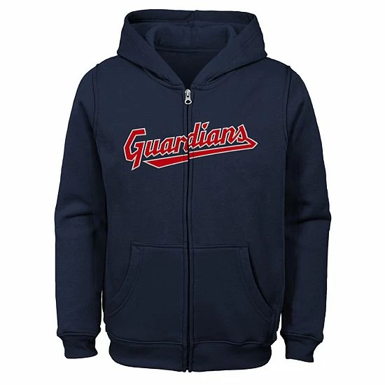 Your young fan can show their loyalty to the Cleveland Guardians with this Wordmark full-zip hoodie. It features tackle twill applique graphics across the front and two slip pockets for warming up hands. The cozy fleece lining and fabric-lined hood also provide an extra layer of warmth for those chilly nights late in the season.