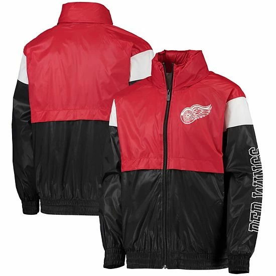 When cold winds threaten to ruin the day, help your young Detroit Red Wings fan meet them head on with this Goal Line windbreaker jacket. Its distinctive design features a mock neck collar and hood for extra chill protection. This full-zip jacket is finished with crisp Detroit Red Wings graphics and a team colorway, so your youngster can keep warm and rep their favorite team in the league.