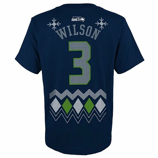 Russell Wilson is ready to help celebrate the holidays with this Holiday Name and Number T-shirt. This festive Seattle Seahawks tee features your kiddo’s favorite player, along with a holiday-inspired design that includes snowflakes and reindeer! Your young fan will be excited and properly prepared to support their team on game day this season when they have this soft T-shirt.