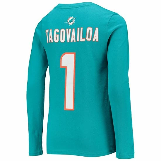 Your kiddo has steadily grown as a football fan, so help them showcase that strengthening pride with this Miami Dolphins Tua Tagovailoa Mainliner Player Name and Number T-shirt. It features crisp graphics and a snug, comfortable fit. When they show up to a team event with this electrifying cotton tee, no one will question who their favorite player is.